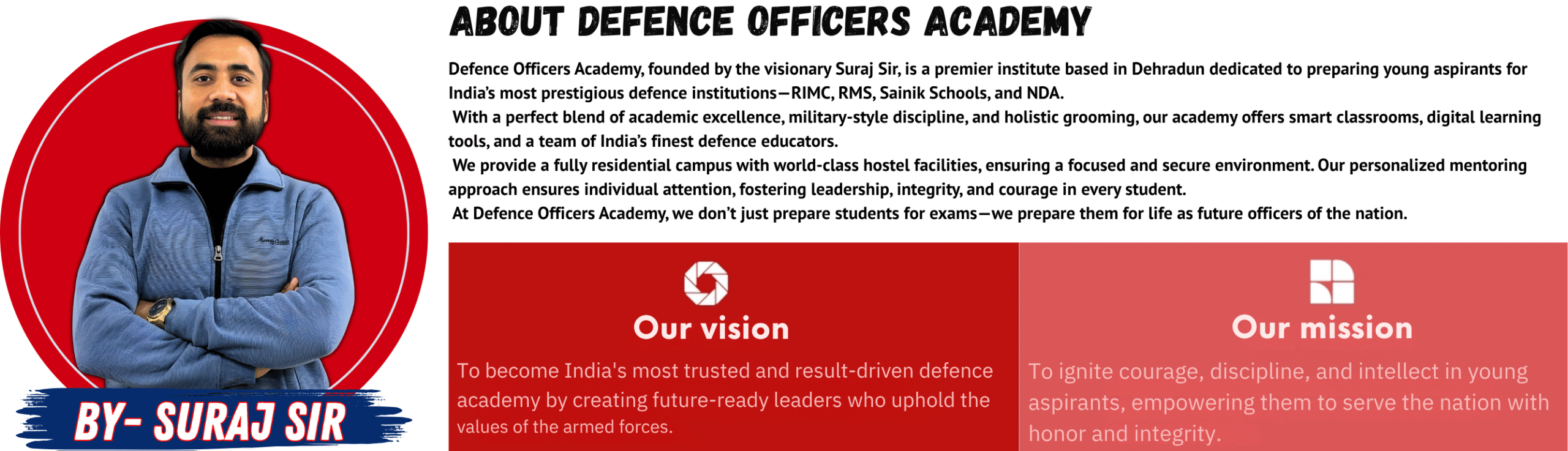 The founder of Defence Officers Academy. With over a decade of experience mentoring students for prestigious defence institutions like RIMC, RMS, Sainik Schools, and NDA, I’ve dedicated my life to transforming young minds into future officers. Here, we don’t just prepare students academically—we build character, discipline, and leadership."